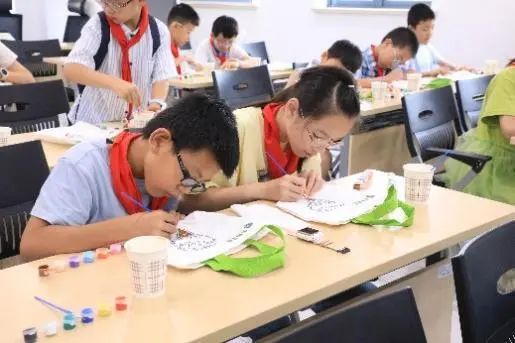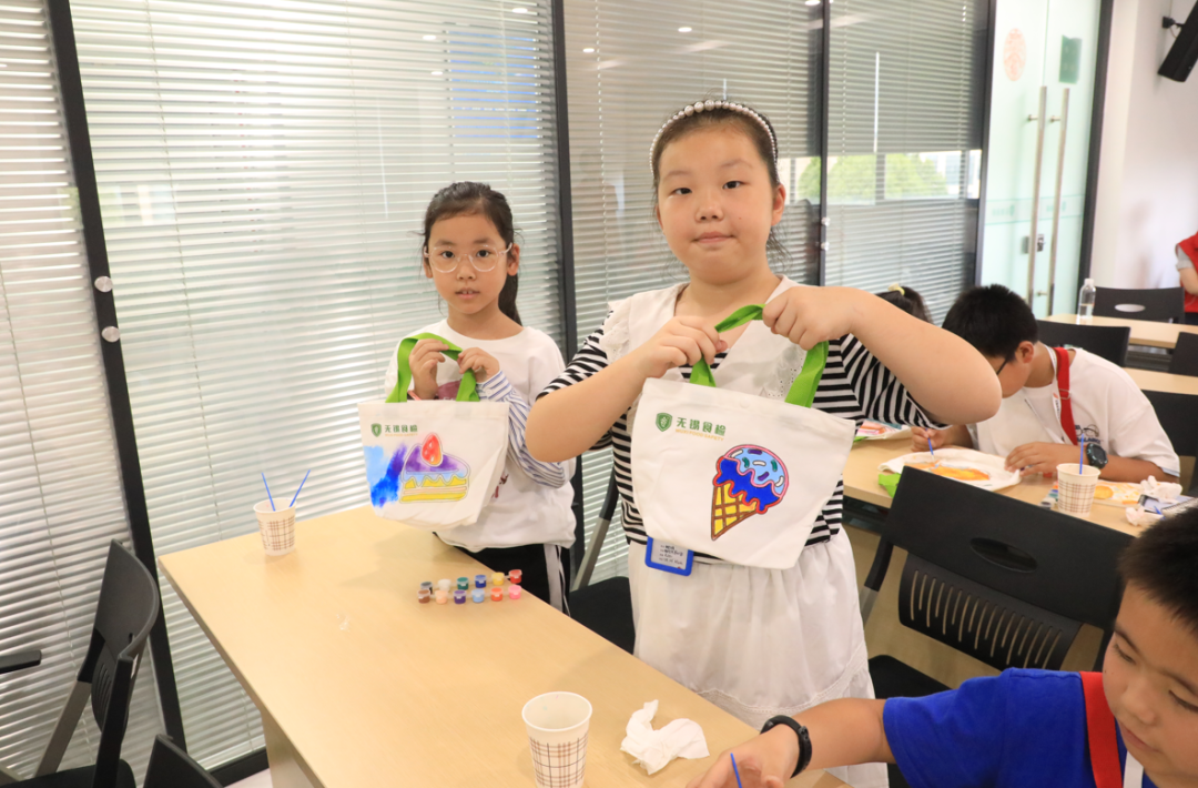帆布包彩绘环节充满欢声笑语。孩子们为蛋糕、饭团等食物线稿填色,用缤纷色彩注释对健康饮食的理解,一幅幅童趣做品成为难忘的暑期回忆。